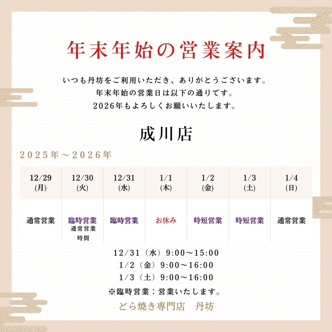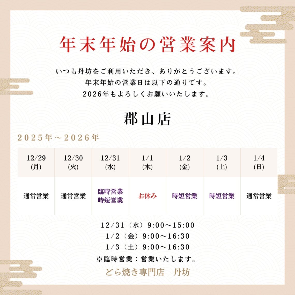 臨時営業 12/31 9:00~15:00(時短)