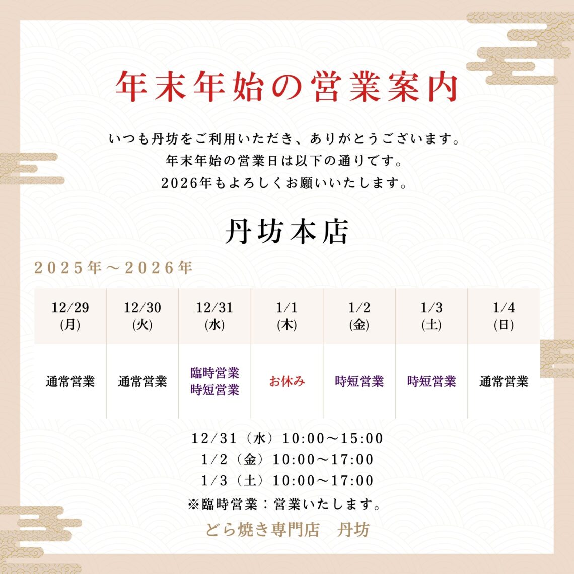 丹坊各店舗の年末年始営業は以下の通りとなります。